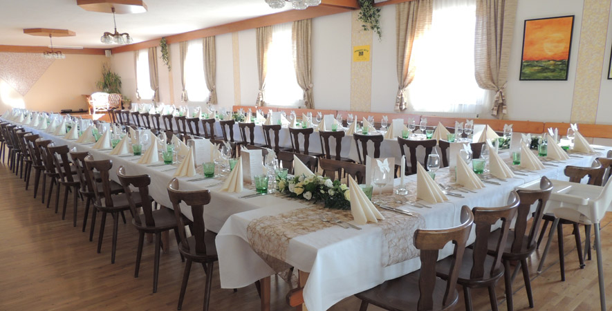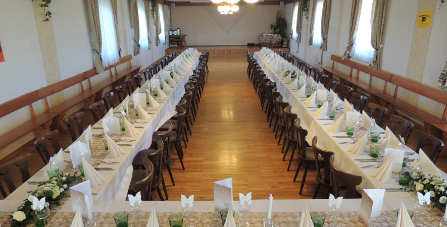 Für größere Feiern und Veranstaltungen vor Ort hat unser Gasthaus Kirchberger & Kegelbahnen natürlich auch etwas zu bieten: 200 Personen und mehr können in unserem geräumigen Festsaal ihr Beisammensein bei gutem Essen und guter Laune genießen.